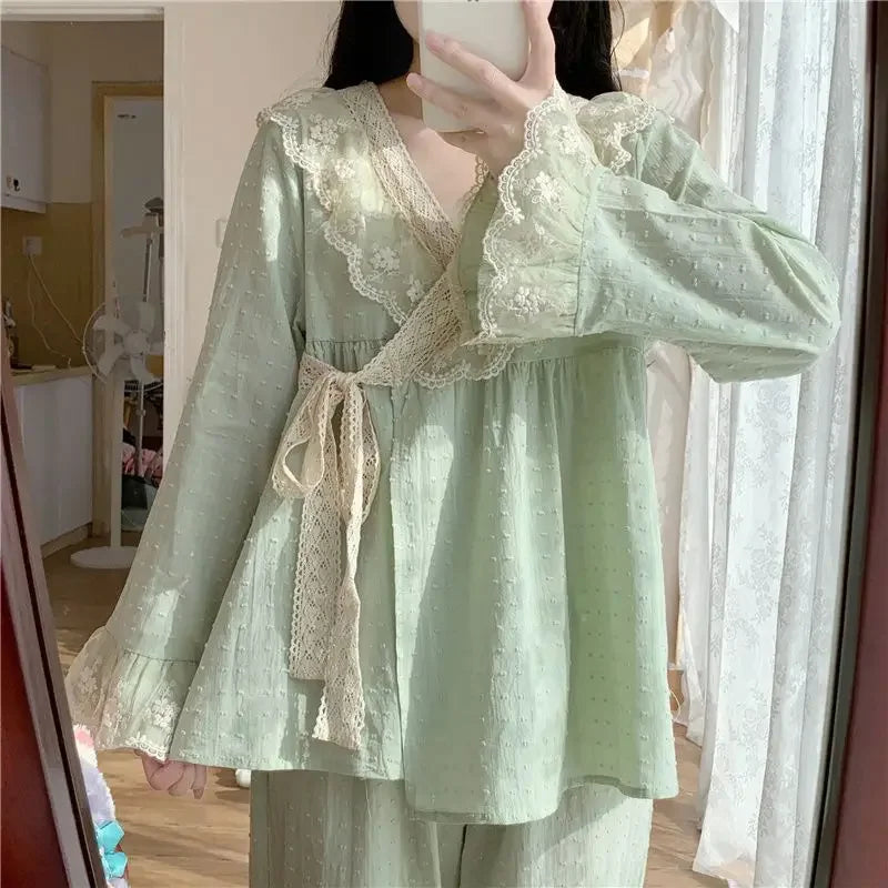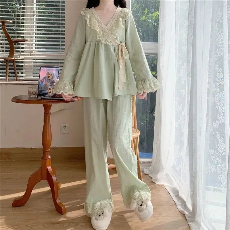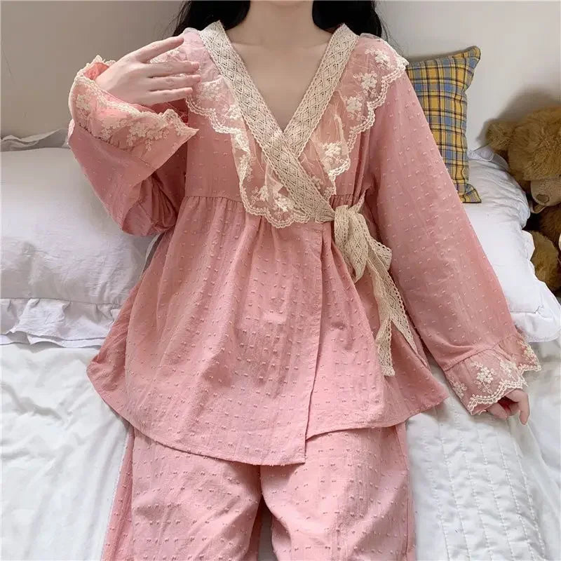 New V-neck Tied Pajama Set for Women Spring Autumn Tops Long Sleeved Pants Lace Lace Pajamas
