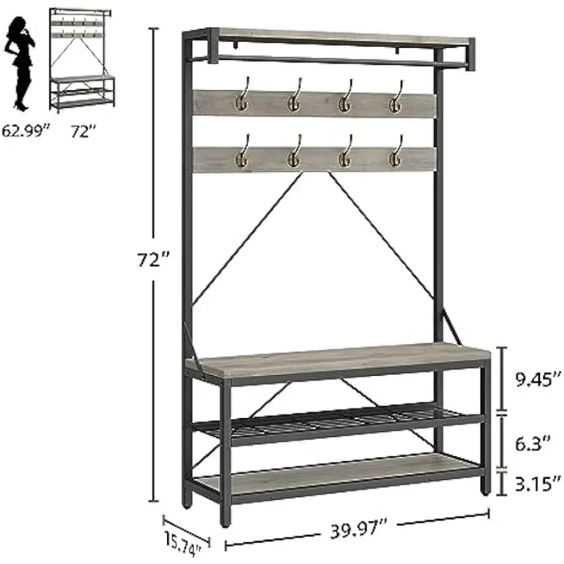 IDEALHOUSE Coat Rack Shoe Bench Industrial Hall Tree Storage Bench for Entryway Wood Look Accent Large Shoe Rack Bench