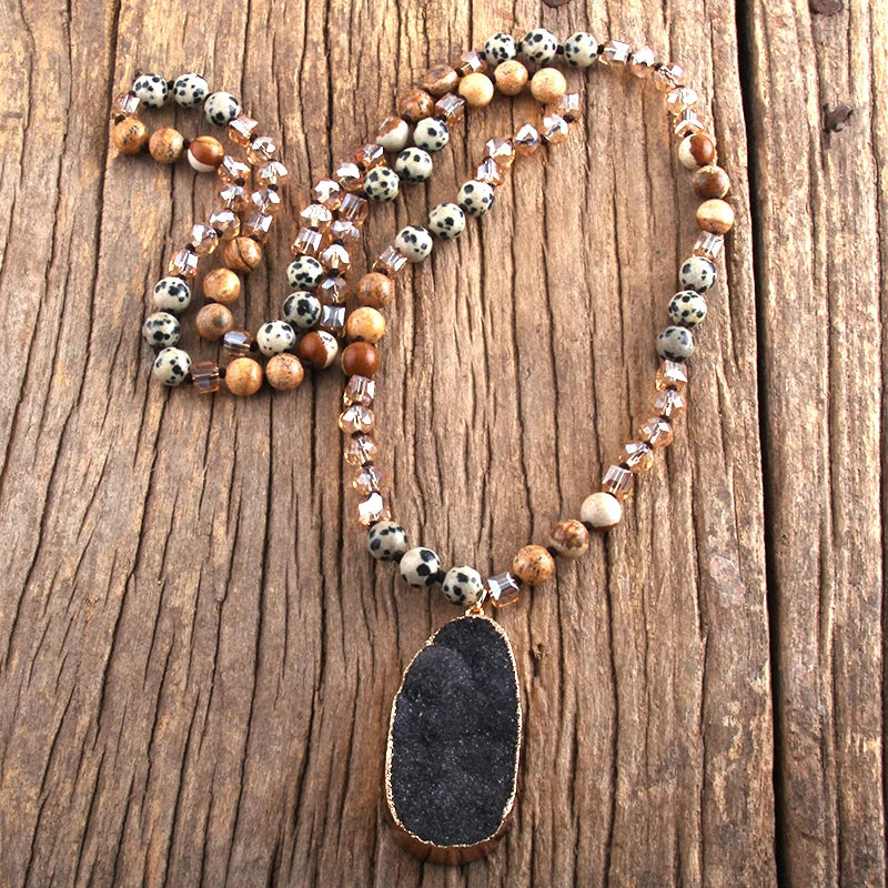 Boho-style necklace with natural stones, crystals, and a druzy drop pendant - a stylish gift for women