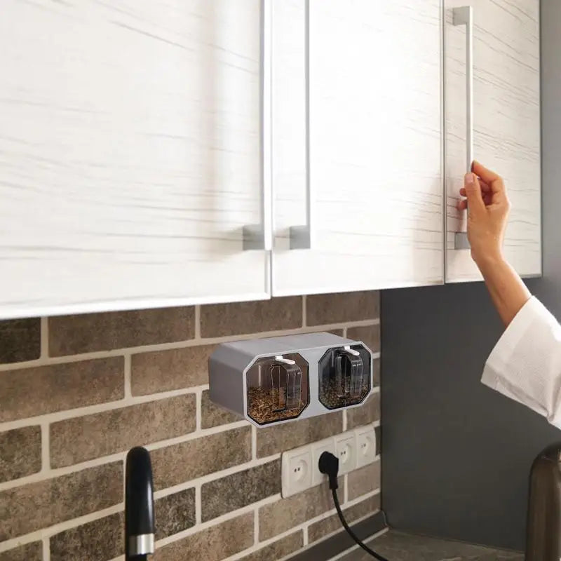 Self-adhesive wall spice rack made of strong, food-grade PP material. Visible design with curtain rod holder and cup sucker for kitchen use